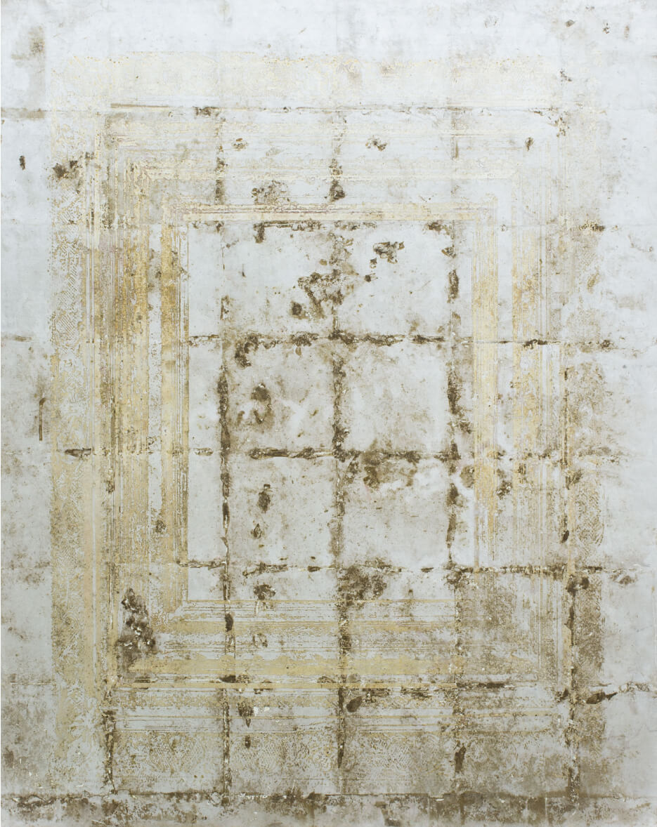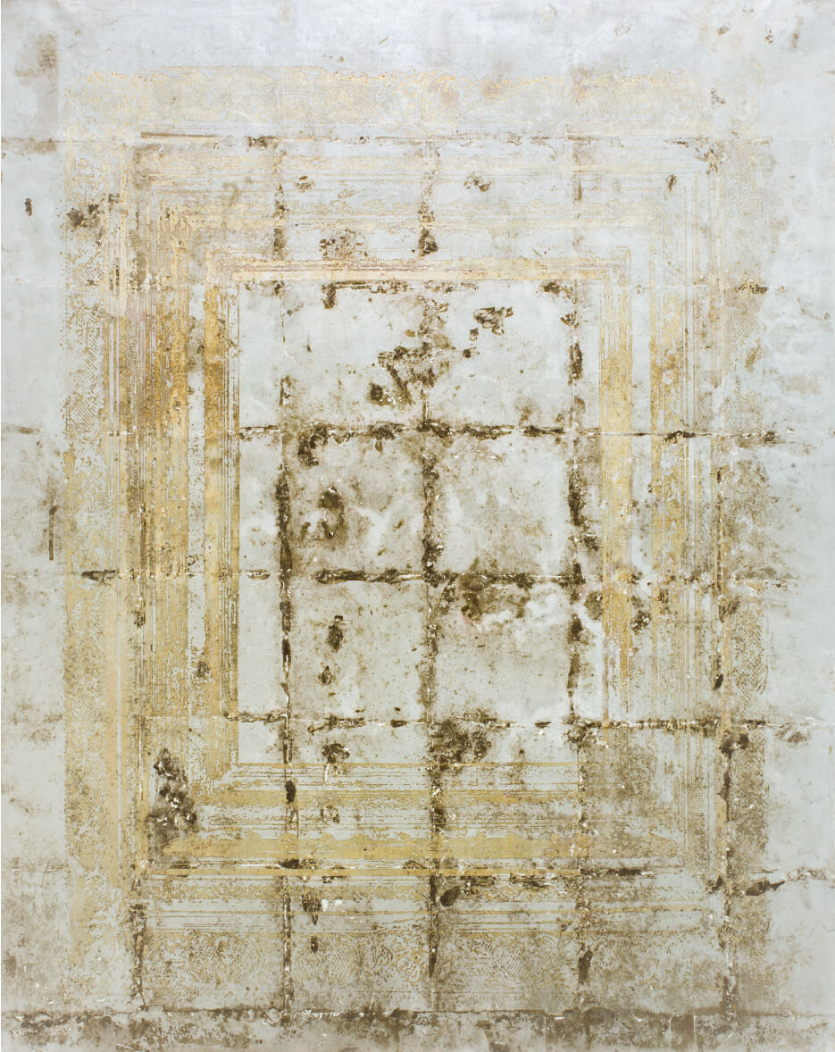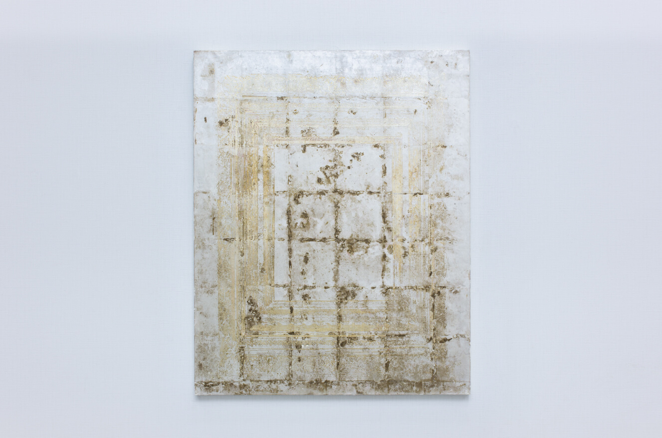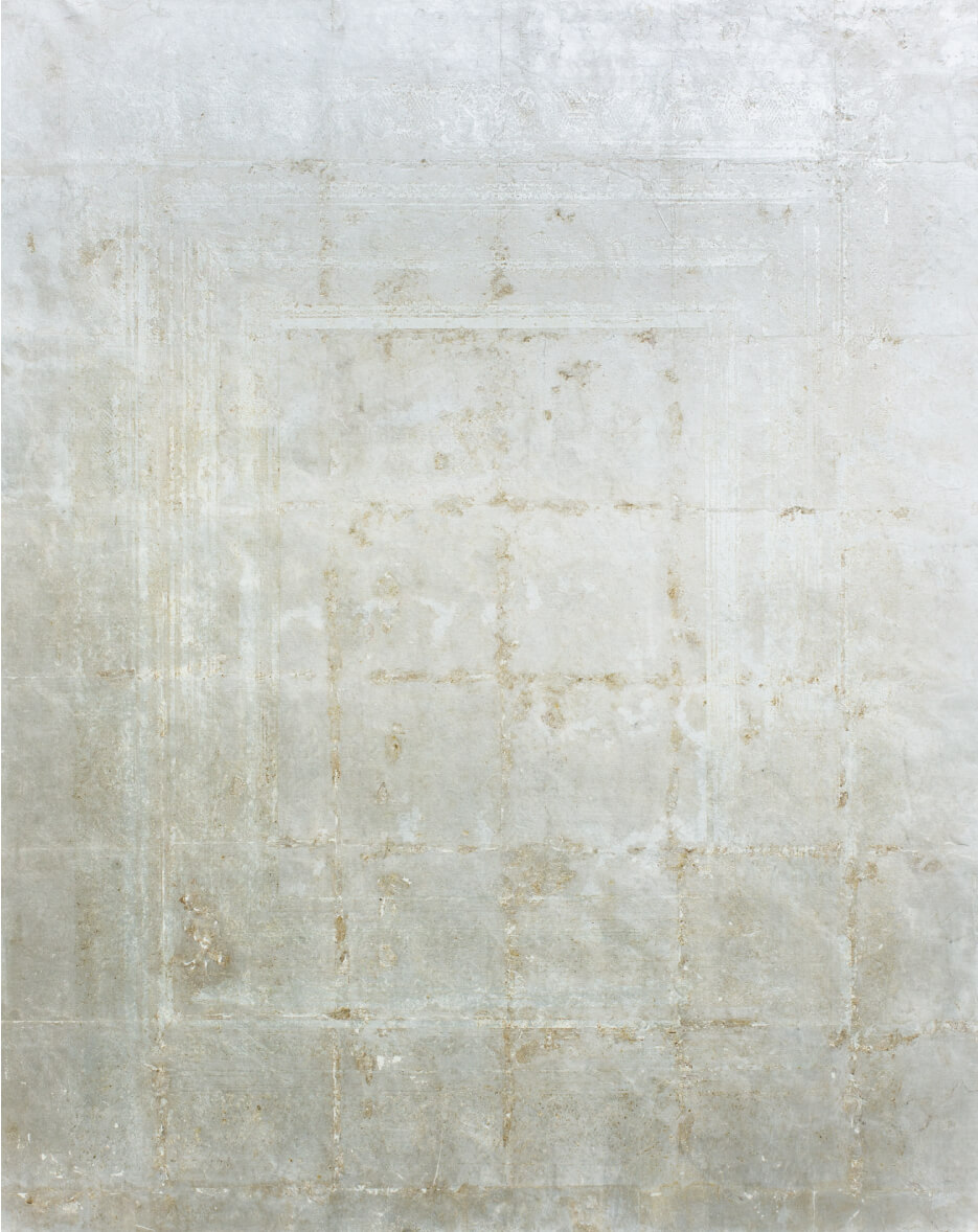 Oil, acrylic gel medium, silver leaf and paper mounted on panel 91.0 × 72.7cm | 2018